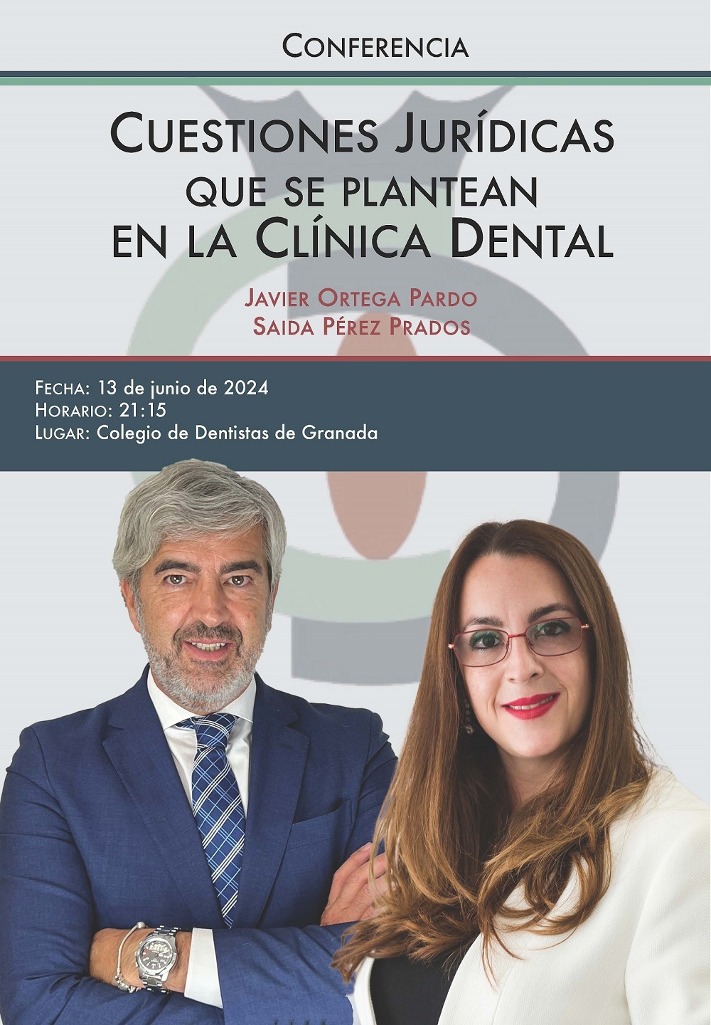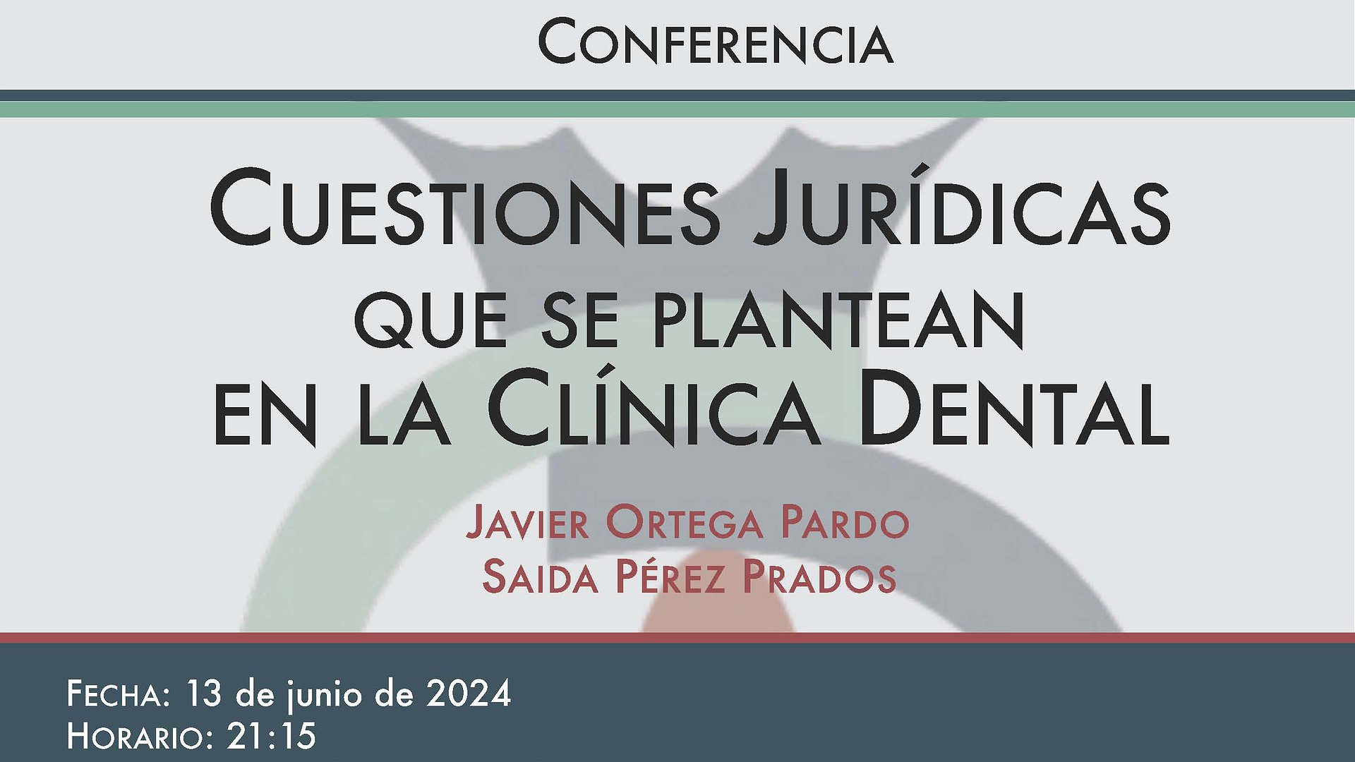 El jueves 13 de junio, a las 21:15 horas, tendrá la lugar la Conferencia “Cuestiones jurídicas que se plantean en la clínica dental”, impartida por D. Francisco Javier Ortega Pardo y Dª Saida Pérez Prados.