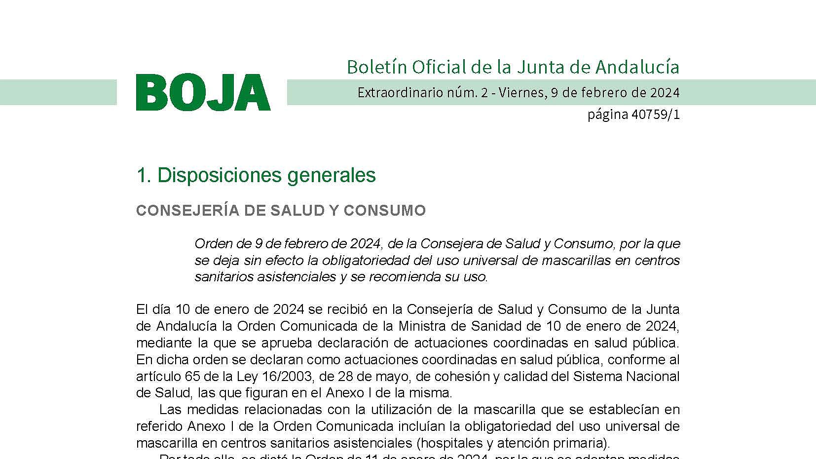 Con fecha 9 de febrero de 2024, se ha publicado en el BOJA la Orden de 9 de febrero de 2024, de la Consejera de Salud y Consumo, por la que se deja sin efecto la obligatoriedad del uso universal de mascarillas en centros sanitarios asistenciales y se recomienda su uso.