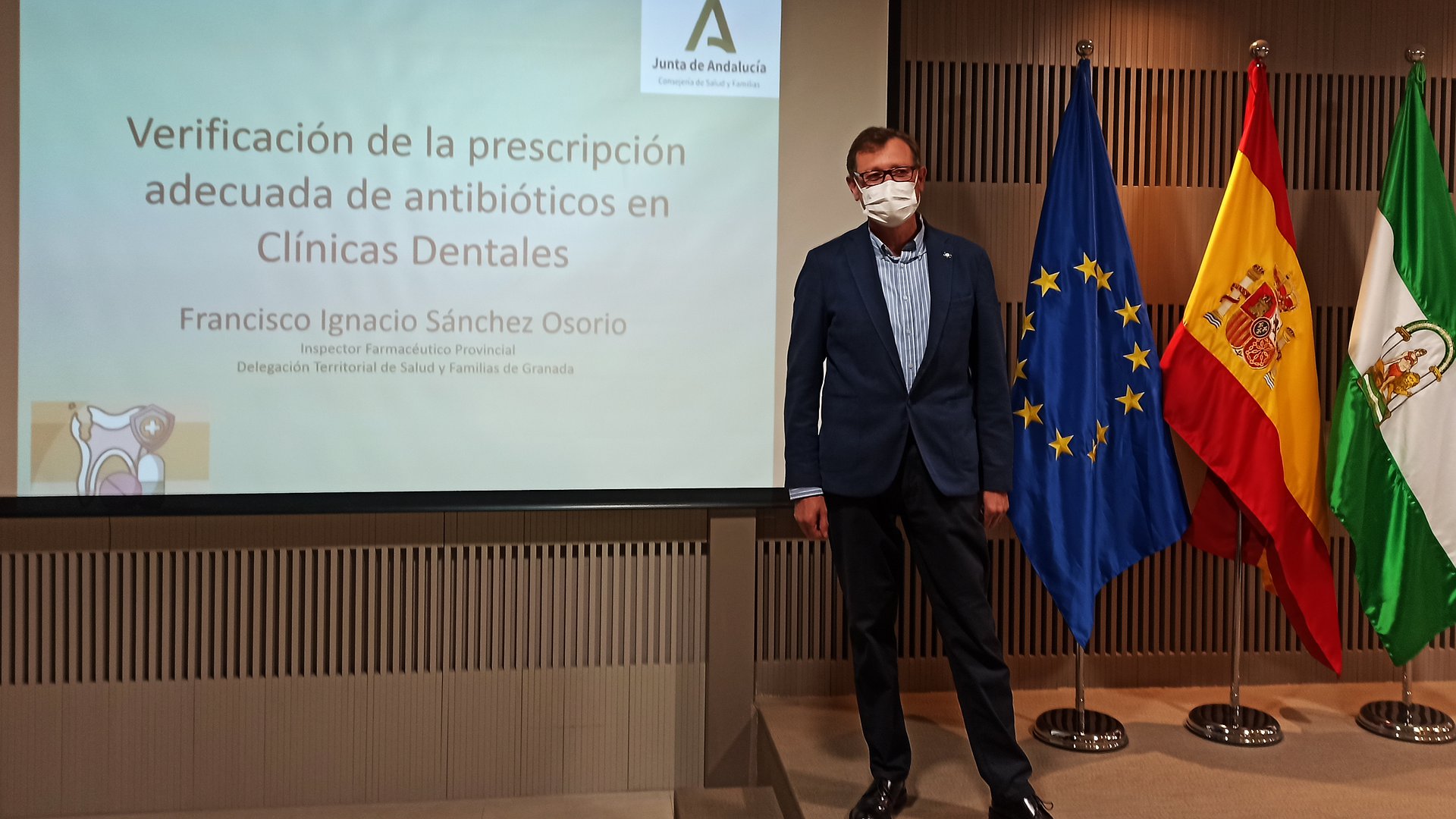 La noche del martes 19 de abril, a las 21:00 horas, tuvo lugar la Conferencia “Verificación de la prescripción adecuada de antibióticos en clínicas dentales”, en la que su ponente, D. Francisco Ignacio Sánchez Osorio, inspector de Farmacia Provincial de la Delegación Territorial de Salud y Familias de Granada, informó a la colegiación sobre la actividad inspectora en relación al uso racional de antibióticos prescritos en clínicas dentales.