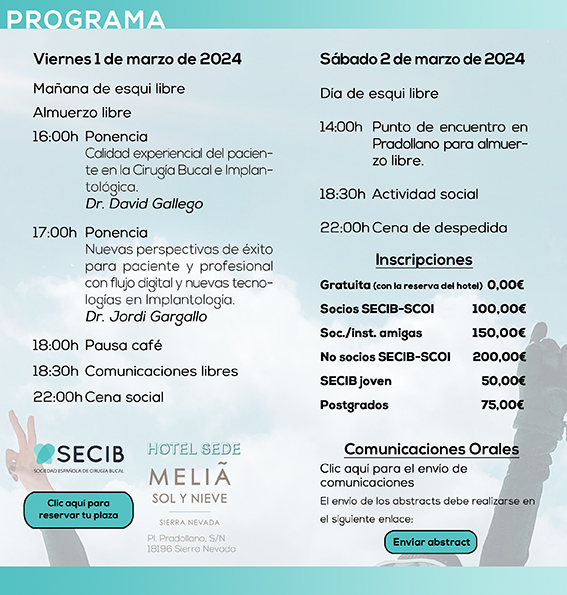 Los días 1 y 2 de marzo de 2024 se celebrará en Sierra Nevada la VI Reunión de Invierno SECIB-SCOI. Acceso a la Información del evento a través del siguient enlace: VI Reunión Invierno SECIB-SCOI | Secib (secibonline.com)
